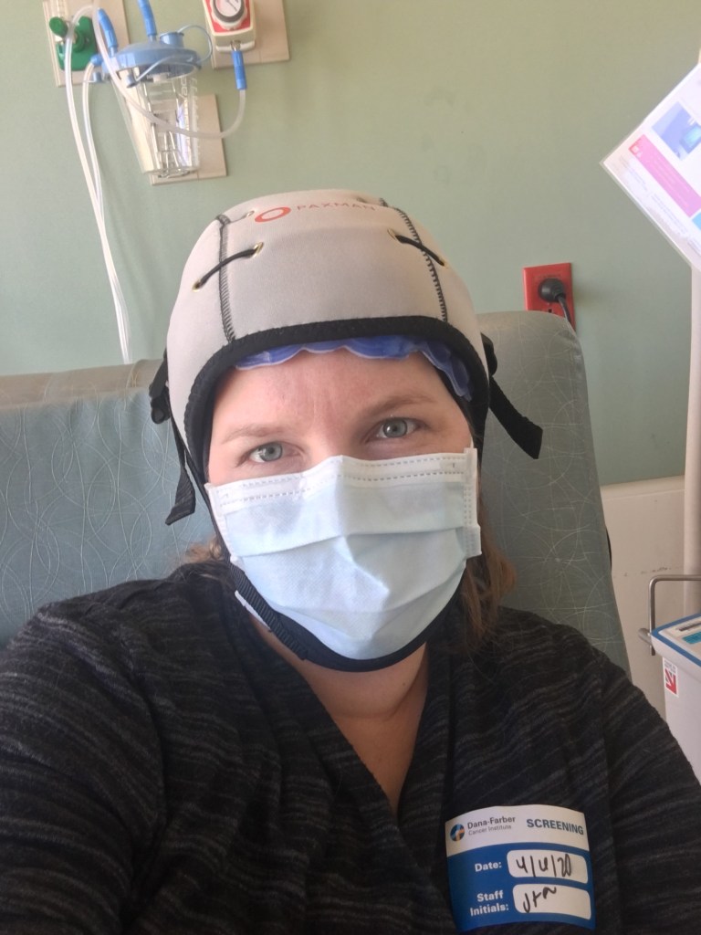 I’ve been meaning to update about my hair and the scalp cooling process. You’ve probably seen in my pictures how I’m wearing a cold cap during chemo. It’s technically a scalp cooling system. Here is a pretty good overview if you’re interested in learning more: https://www.paxmanusa.com/patients/scalp-cooling-overview/